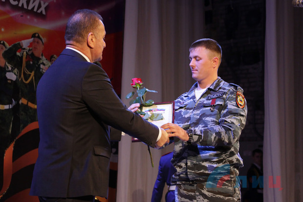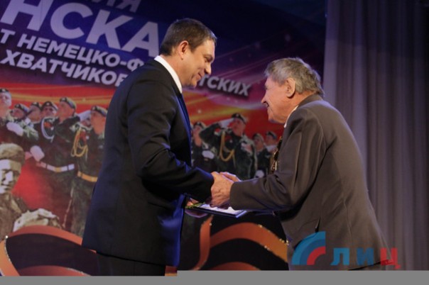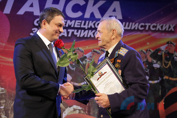 В ходе награждения ветеранов поздравительными адресами и.о. главы ЛНР также вручил почетный знак "Битва за Луганск" участнику боевых действий Великой Отечественной войны, освободителю Луганска от немецко-фашистских захватчиков Николаю Зелинскому. Кроме того, грамоты и благодарности от и.о. главы Республики и главы администрации Луганска были вручены активистам ветеранских организаций, военнослужащим Народной милиции, сотрудникам МЧС ЛНР и активной молодежи.