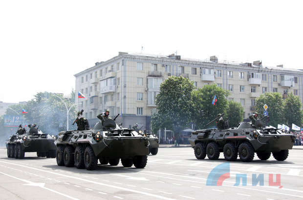 В Народной милиции рассказали, что по Театральной площади проехали танки Т-72, боевые машины пехоты БМП-2, бронетранспортеры БТР-80, 152-мм самоходные артиллерийские установки (САУ) "Гвоздика", 152-мм гаубицы 2А65 "Мста-Б", 122-мм гаубицы Д-30, реактивные системы залпового огня БМ-21 "Град". Замыкали колонну зенитно-ракетные комплексы 9К35 "Стрела-10".
