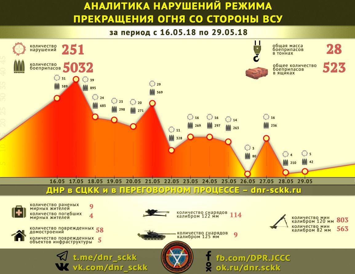 Всего за период с 16 по 29 мая зафиксировано 251 нарушение режима прекращения огня со стороны ВСУ. В результате обстрелов погибли 4 и ранены 9 мирных жителей, разрушено 2 и повреждены 56 домостроений, а также пять объектов инфраструктуры.