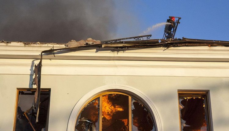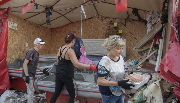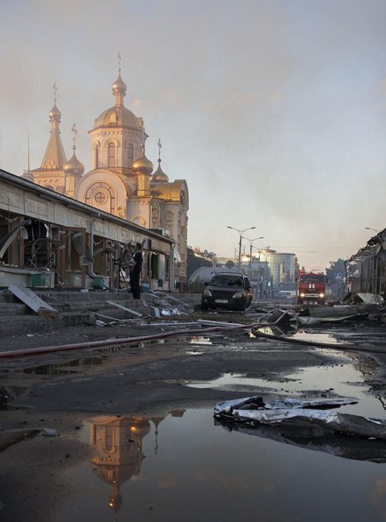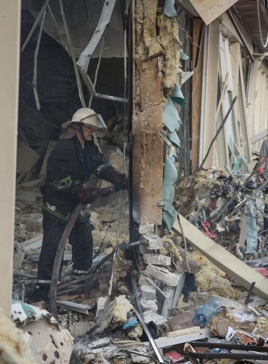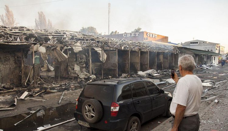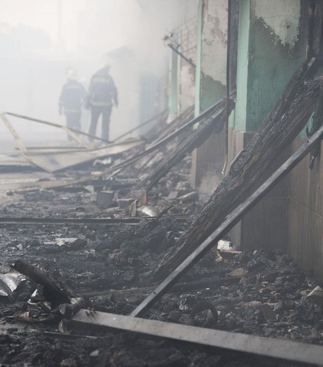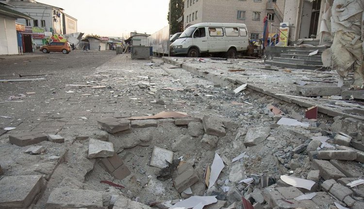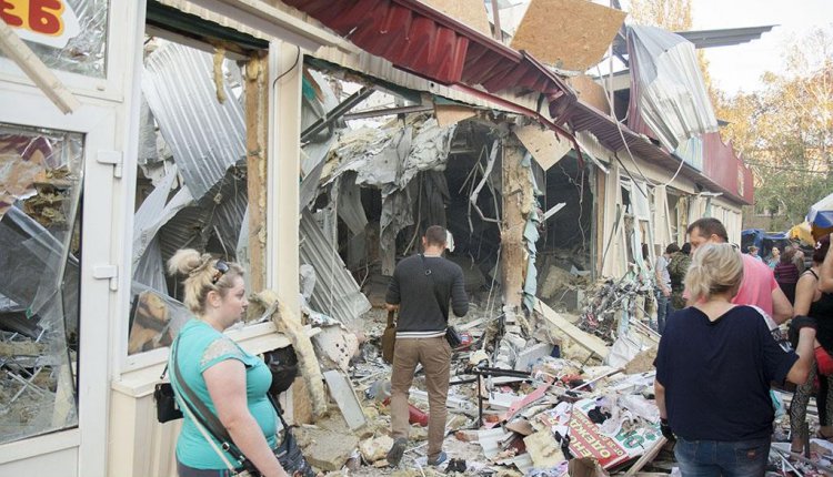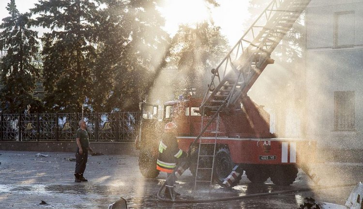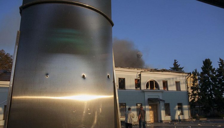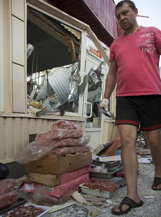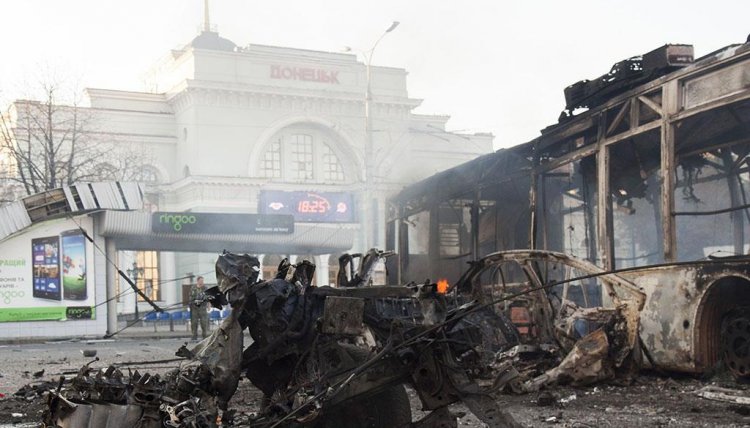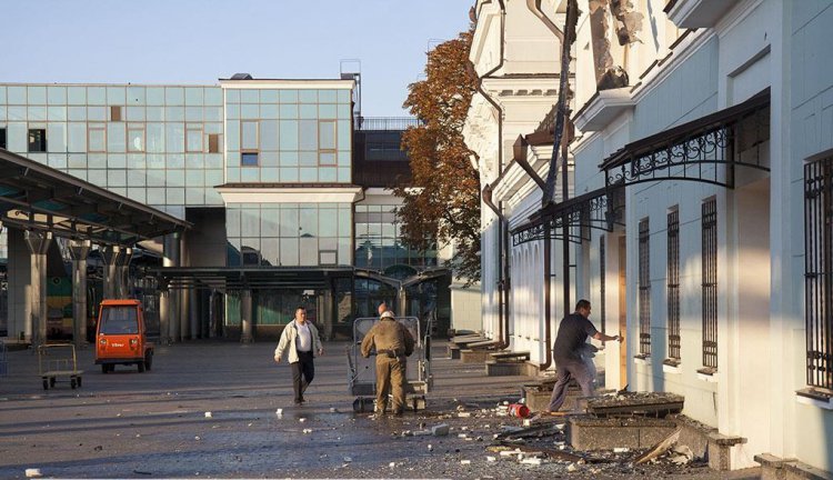Сегодня в 17.30 был совершен массированный артобстрел железнодорожного вокзала Донецка. На площади перед вокзалом снаряд попал в легковой автомобиль, рядом с ним полностью сгорел троллейбус. Практически полностью уничтожен привокзальный рынок, сильно поврежден фасад гостиницы. В левом крыле старого здания Ж/Д вокзала сгорел второй этаж. К счастью, люди успели укрыться в убежище.