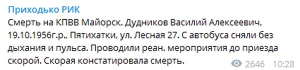 62-летний Дудников Василий Алексеевич, житель горловского поселка Пятихатки, умер сегодня утром. По информации Приходько, мужчина скончался в автобусе. Реанимационные мероприятия пытались проводить еще до приезда «скорой». Но тщетно. Прибывшая на место трагедии «скорая помощь» констатировала смерть.