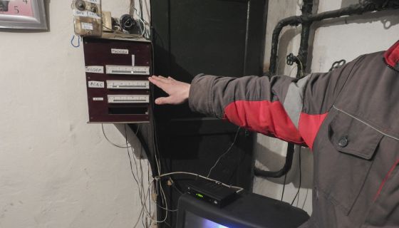 Следующую комнату можно считать и жилым помещением, и пунктом управления. Старенький телевизор из 90-х, двухэтажные койки, как в казарме, — а на стене панель с выключателями и рубильниками. Именно отсюда поступают команды в основное здание, где установлена сама насосная система, — да, по большому счёту это запрещено инструкциями по эксплуатации, но по крайней мере сотрудники "Воды Донбасса" делают это с минимальным риском для жизни.