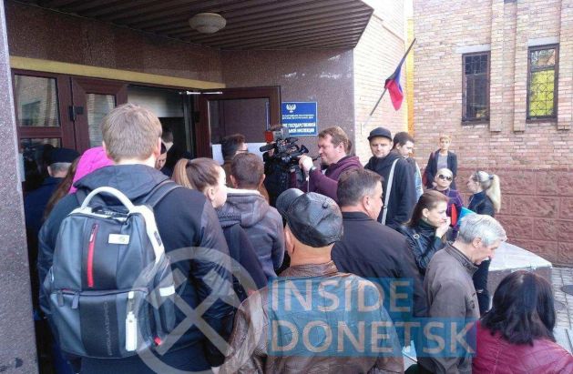 Автор донецкого Telegram-канала Inside Donetsk показывает очередь у входа в здание Миграционной службы ДНР в Донецке в 9 утра.
