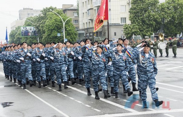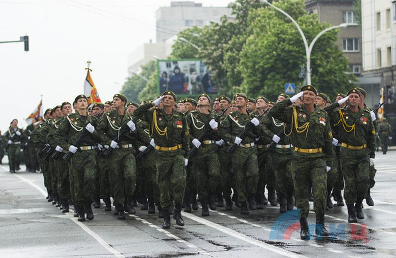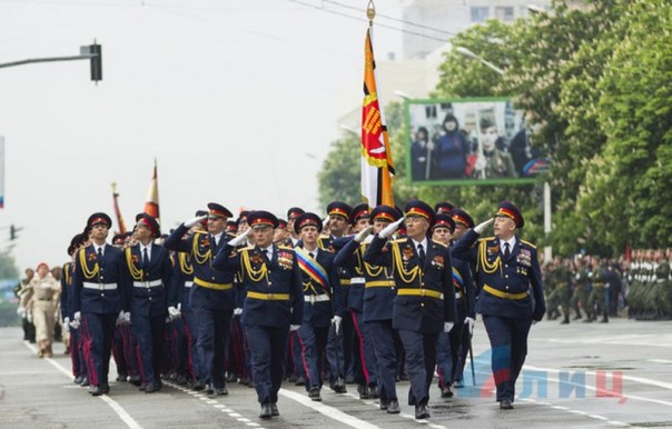 В параде приняли участие действующие военнослужащие, сотрудники правоохранительных органов ЛНР, МЧС, курсанты Луганского казачьего кадетского корпуса имени маршала авиации Александра Ефимова.