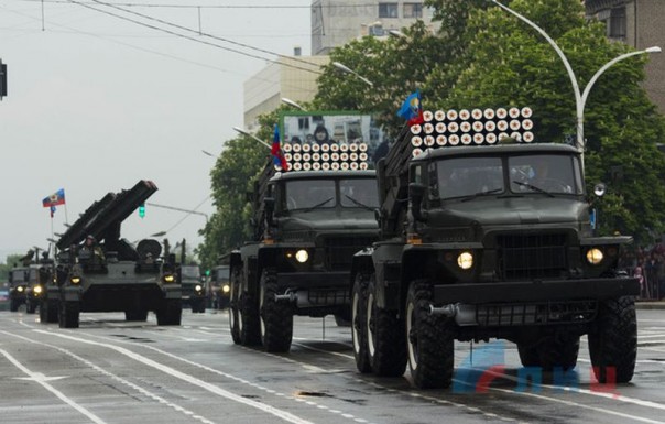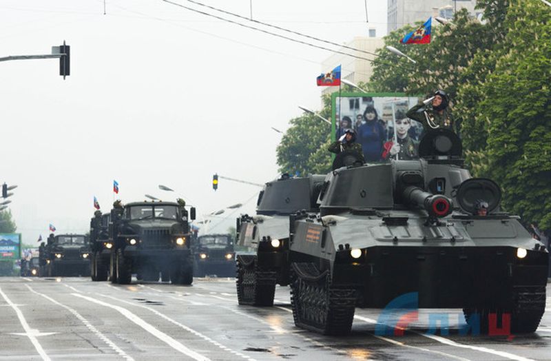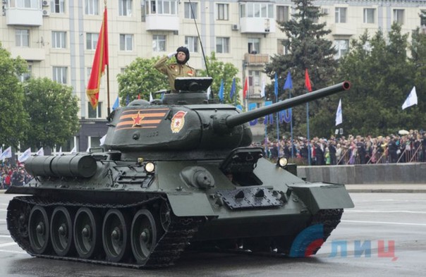 Парад военной техники и вооружения, как и в Донецке, возглавил танк Т-34 в сопровождении военных мотоциклов времен Великой Отечественной войны.