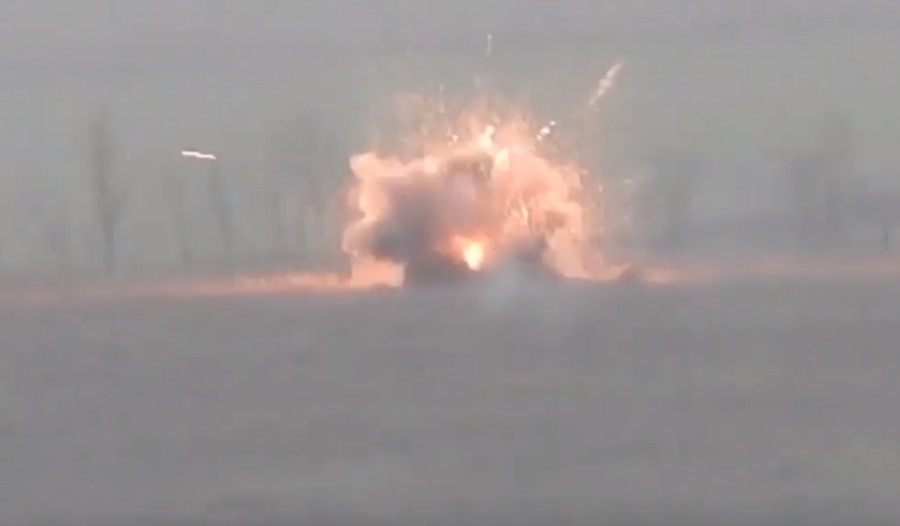 На записи видно, как в боевую машину пехоты летит ракета, после чего БМП разлетается на части.