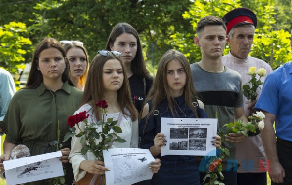 Участники акции представили выдержки из материалов общественного расследования "Применение вооруженными силами Украины штурмовой авиации против мирных жителей в ходе вооруженного конфликта в Донбассе", минутой молчания почтили память жертв украинской агрессии в Донбассе и возложили венки и цветы к памятному знаку погибшим детям Луганщины.