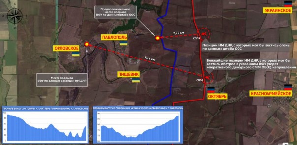 «По имеющимся данным разведки НМ ДНР, гибель 4 военнослужащих ВФУ произошла в результате неосторожных действий при разгрузке противопехотных мин вблизи села Орловское. На карте-схеме отражено место этого происшествия, кроме того, обозначены ближайшие позиции НМ с которых мог бы вестись огонь в указанном ВФУ (через оперативного дежурного СММ ОБСЕ) направлении. Однако ни профиль высот, ни тактико-технические характеристики указанного вооружения не позволяют вести огонь в этом направлении», — заключили в СЦКК.
