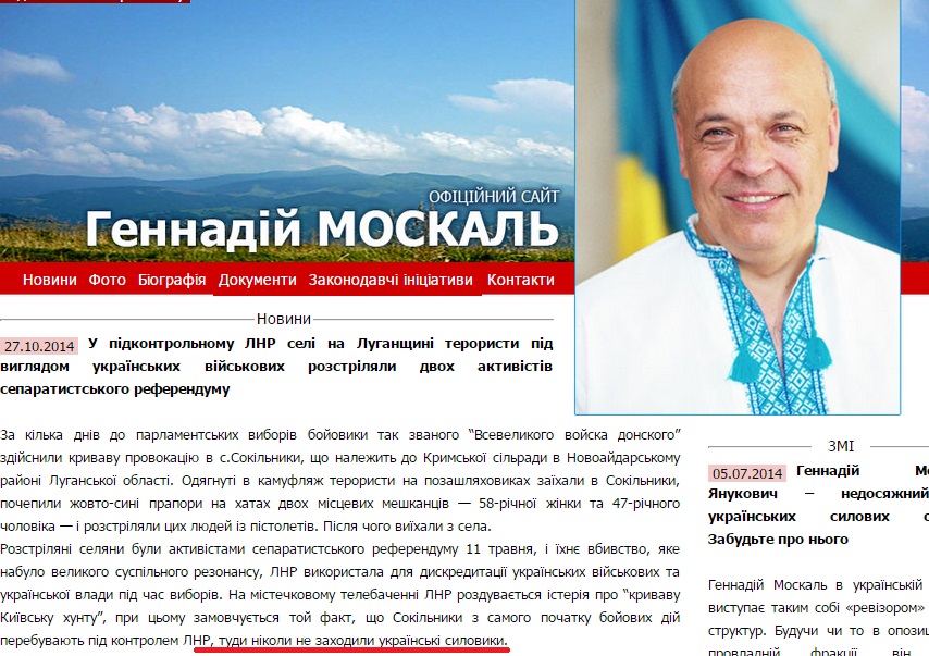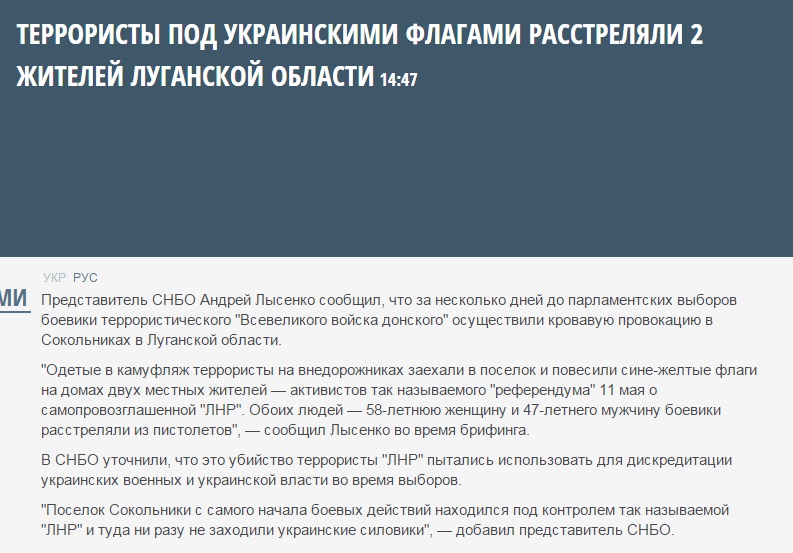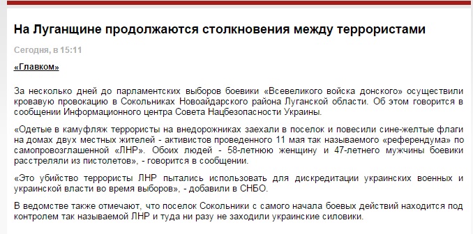 «Расстрелянные крестьяне были активистами сепаратистского референдума 11 мая, и их убийство, которое вызвало большой общественный резонанс, ЛНР использовала для дискредитации украинских военных и украинской власти во время выборов. На местном телевидении ЛНР раздувается истерия о "кровавой Киевской хунте", при этом замалчивается тот факт, что Сокольники с самого начала боевых действий находятся под контролем ЛНР, туда никогда не заходили украинские силовики», — сообщается на сайте губернатора Луганщины.