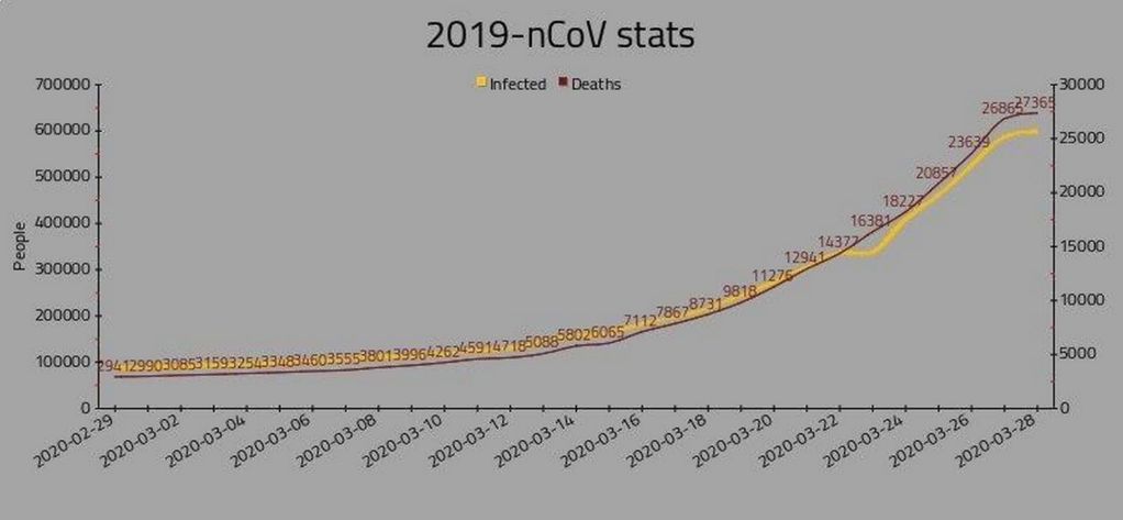 Что касается статистики распространения вируса в мире на 28 марта, то подтверждено 597 335 (+11 195) инфицированных, выздоровели 131 712 (+854) человек, умерли от коронавируса 27 365 (+500).