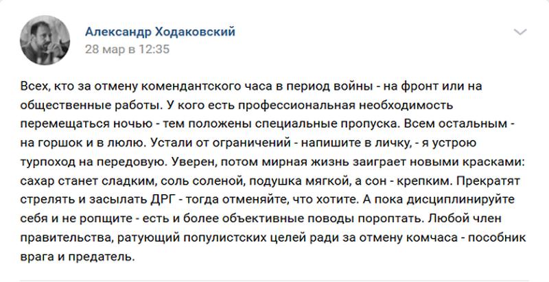 Экс-глава Совета безопасности ДНР, основатель батальона «Восток» Александр Ходаковский выступил против отмены комендантского часа и за введение военного положения в ДНР.