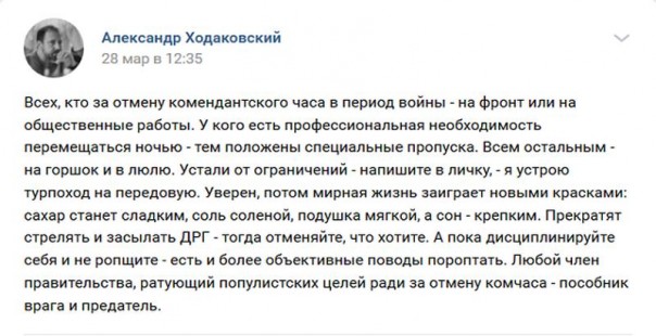 По его убеждению, всех, кто агитирует за отмену комендантского часа во время войны, нужно отправить на фронт или на общественные работы.