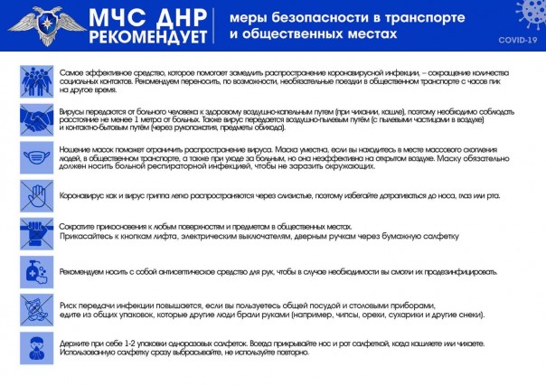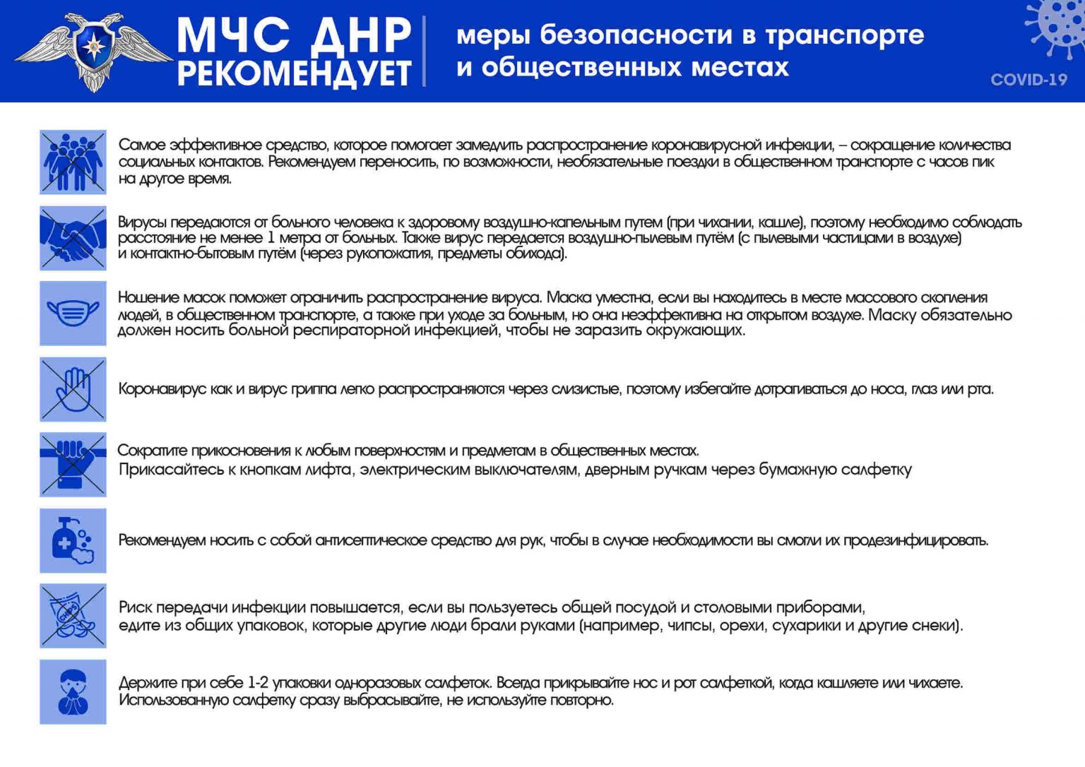 Министерство по делам гражданской обороны, чрезвычайным ситуациям и ликвидации последствий стихийных бедствий Донецкой Народной Республики напоминает гражданам о необходимости соблюдения в условиях борьбы с коронавирусной инфекцией мер безопасности в транспорте и общественных местах.