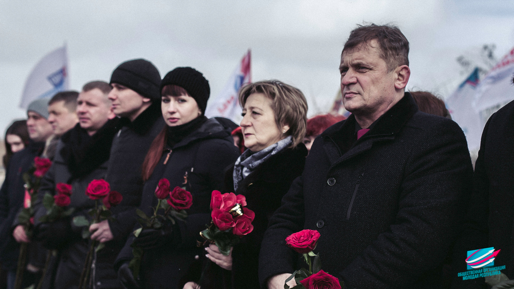 Участники митинга возложили цветы к памятному знаку погибшим в 2014-2015 годах и развернули 200-метровое Знамя Победы.