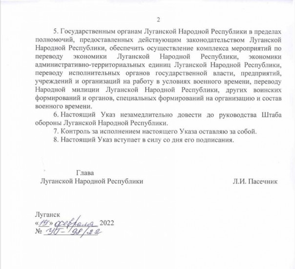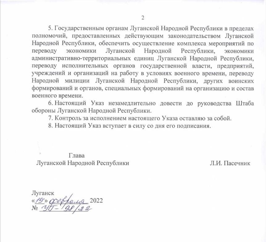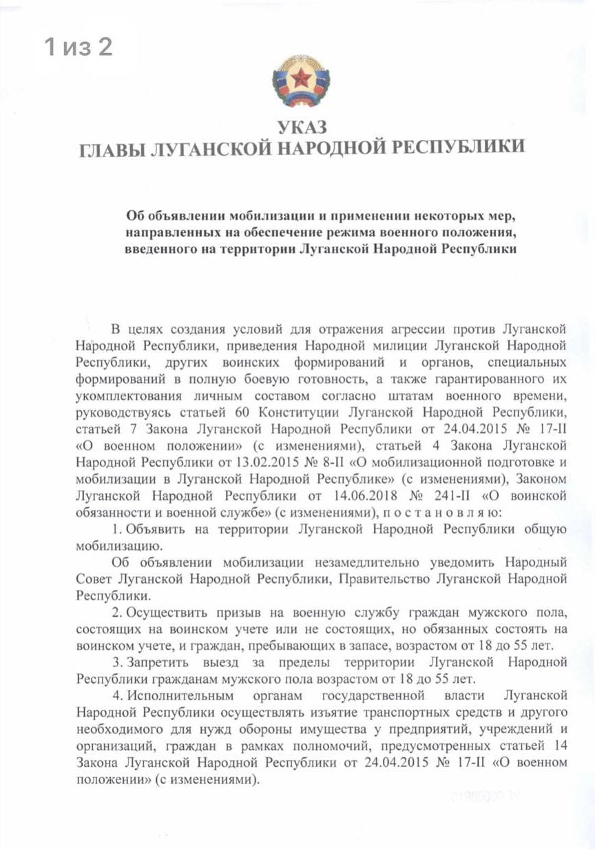 "В целях создания условий для отражения агрессии против Луганской Народной Республики, приведения Народной милиции Луганской Народной Республики, других воинских формирований и органов, специальных формирований в полную боевую готовность, а также гарантированного их укомплектования личным составом согласно штатам военного времени, руководствуясь статьей 60 Конституции Луганской Народной Республики, <…> постановляю: Объявить на территории Луганской Народной Республики общую мобилизацию. Об объявлении мобилизации незамедлительно уведомить Народный Совет Луганской Народной Республики", - говорится в документе, подписанном в 09:00 19 февраля.