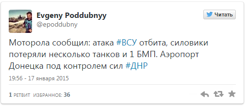 Днем 17 января украинские войска перешли в контрнаступление в Донецке. Силовики с помощью танков и дополнительных сил пехоты пытаются вернуть контроль над аэропортом. По позициям ополченцев работают самоходные артиллерийские установки и РСЗО «Град».