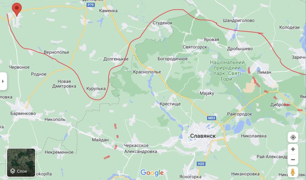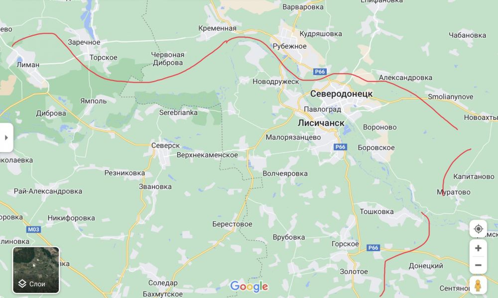 С Северском понятно - цель усилить оборону так как тут по плану наиболее удобное место для атаки и замыкания котла движущейся с севера Группы О. На сегодня линия фронта на этом участке проходит примерно так