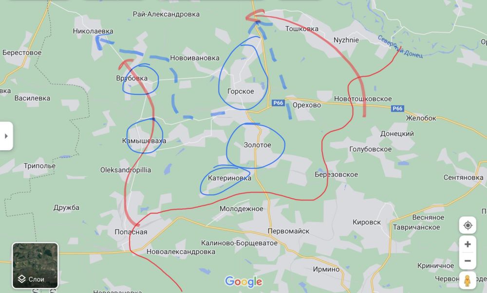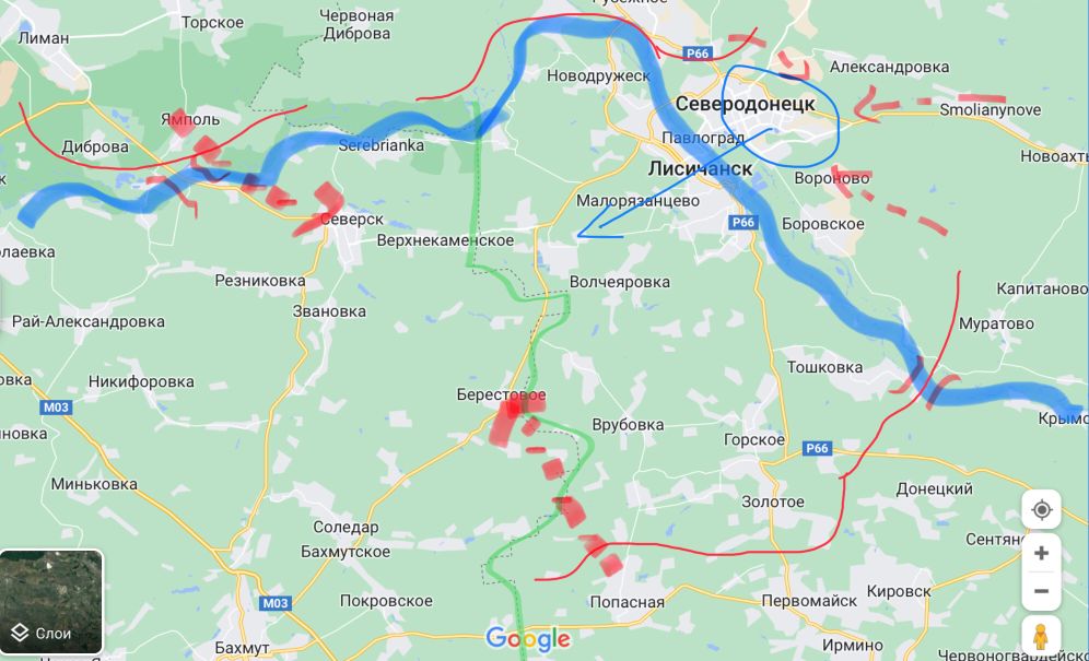 Большой соблазн начать наступление через Камышеваху с целью пресечения отхода на Бахмут. Но… ВСУ не даром отвели войска в Бахмут из Лисичанска. В случае наступления группировка из горско-золотого не будет отступать в Лисичанск а вместе с войсками из Бахмут ударят по флангам. Это может привести как к окружению наступающих войск, так и при негативном сценарии к потере Попасной.