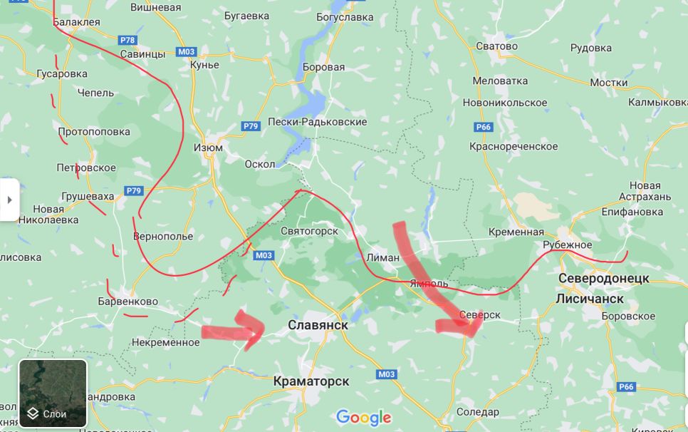 ВСУ пытается опереться на два укрепрайона Славянск и Северск с целью не допустить синхронной атаки войск РФ из района южнее Изюма на Славянск и из района Ямполя (который возьмут в ближайшие дни) на Северск. Воска РФ наоборот стремятся занять следующие исходные позиции для удара. После выхода на эти рубежи и краткой оперативной паузы можно ожидать штурма Славянска с западного направления и удар на Северск с севера. ВСУ укрепляет позиции на угрожаемых направлениях.