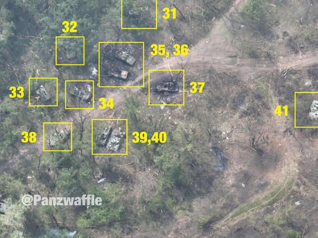 Номера 39 и 40 это танки Т-72, возможно Б. Причем машины не выглядят поврежденными. Впрочем, это не новость. У обеих сторон конфликта больше всего боли и унижений испытывает «легкая» броня советской разработки — БМП, БТР, МТ-ЛБ и БРДМ.