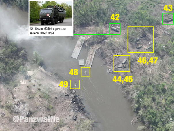 Серия фото с горами битой техники рядом с переправой через Северский Донец вызывала целый шквал обсуждений. Украинская сторона празднует очередную победу в твиттере, мамкин OSINT кропотливо считает обломки, среди (про)российских наблюдателей царит уныние. В общем пришло расчехлять любимый флюгегехаймен и браться за дело.