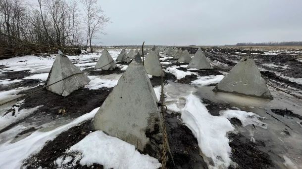 По обе стороны от трассы к горизонту уходят глубокие противотанковые рвы, непреодолимые для гусеничной техники. А перед ними в землю врыты так называемые зубы дракона — бетонные пирамидки, скрепленные цепями. По две тонны каждая.