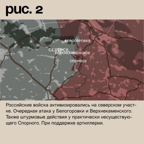 Российские войска активизировались на северском участке. Очередная атака у Белогоровки и Верхнекаменского. Также штурмовые действия у практически несуществующего Спорного. При поддержке артиллерии. (Рис. 2)