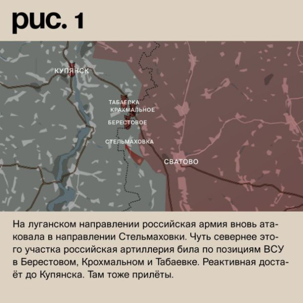 На луганском направлении российская армия вновь атаковала в направлении Стельмаховки. Чуть севернее этого участка российская артиллерия била по позициям ВСУ в Берестовом, Крахмальном и Табаевке. Реактивная достаёт до Купянска. Там тоже прилёты. (Рис. 1)