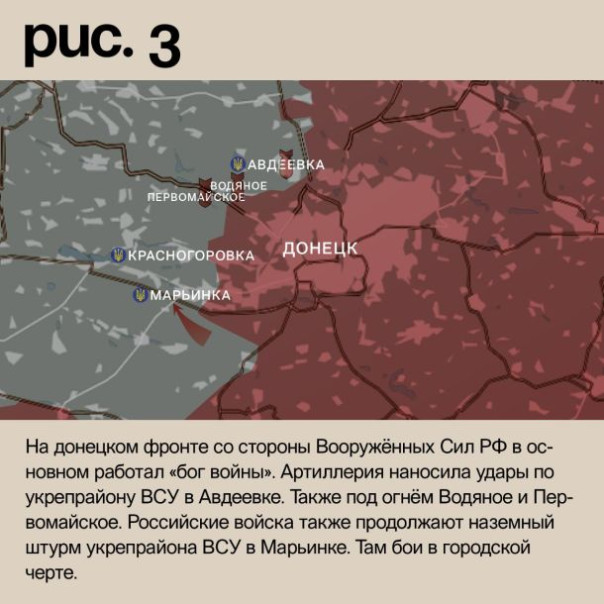 На донецком фронте со стороны Вооружённых Сил РФ в основном работал «бог войны». Артиллерия наносила удары по укрепрайону ВСУ в Авдеевке. Также под огнём Водяное и Первомайское. Российские войска также продолжают наземный штурм укрепрайона ВСУ в Марьинке. Там бои в городской черте. (Рис. 3)