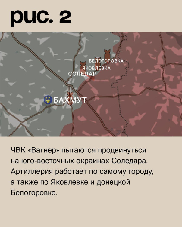 ЧВК «Вагнер» пытаются продвинуться на юго-восточных окраинах Соледара. Артиллерия работает по самому городу, а также по Яковлевке и донецкой Белогоровке. (Рис. 2)