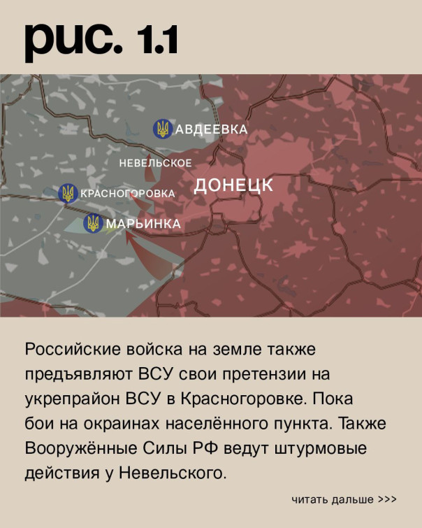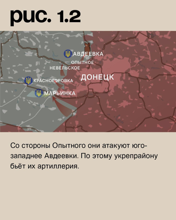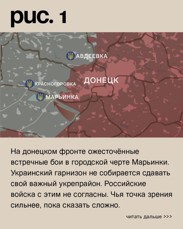 На донецком фронте ожесточённые встречные бои в городской черте Марьинки. Украинский гарнизон не собирается сдавать свой важный укрепрайон. Российские войска с этим не согласны. Чья точка зрения сильнее, пока сказать сложно. Российские войска на земле также предъявляют ВСУ свои претензии на укрепрайон ВСУ в Красногоровке. Пока бои на окраинах населённого пункта. Также Вооружённые Силы РФ ведут штурмовые действия у Невельского. Со стороны Опытного они атакуют юго-западнее Авдеевки. По этому укрепрайону бьёт их артиллерия. (Рис. 1)