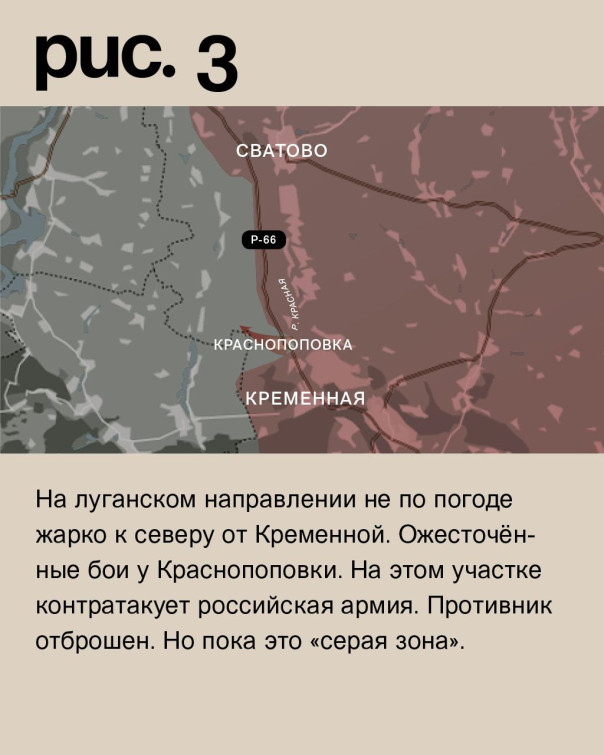 На луганском направлении не по погоде жарко к северу от Кременной. Ожесточённые бои у Краснопоповки. На этом участке контратакует российская армия. Противник отброшен. Но пока это «серая зона». (Рис. 3) Источник