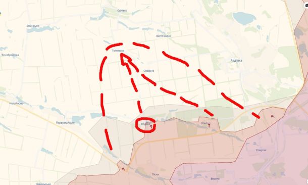 В случае развития успеха, российские войска смогут выйти в тыл Первомайское-Карловка и во фланг всу в Авдеевке.