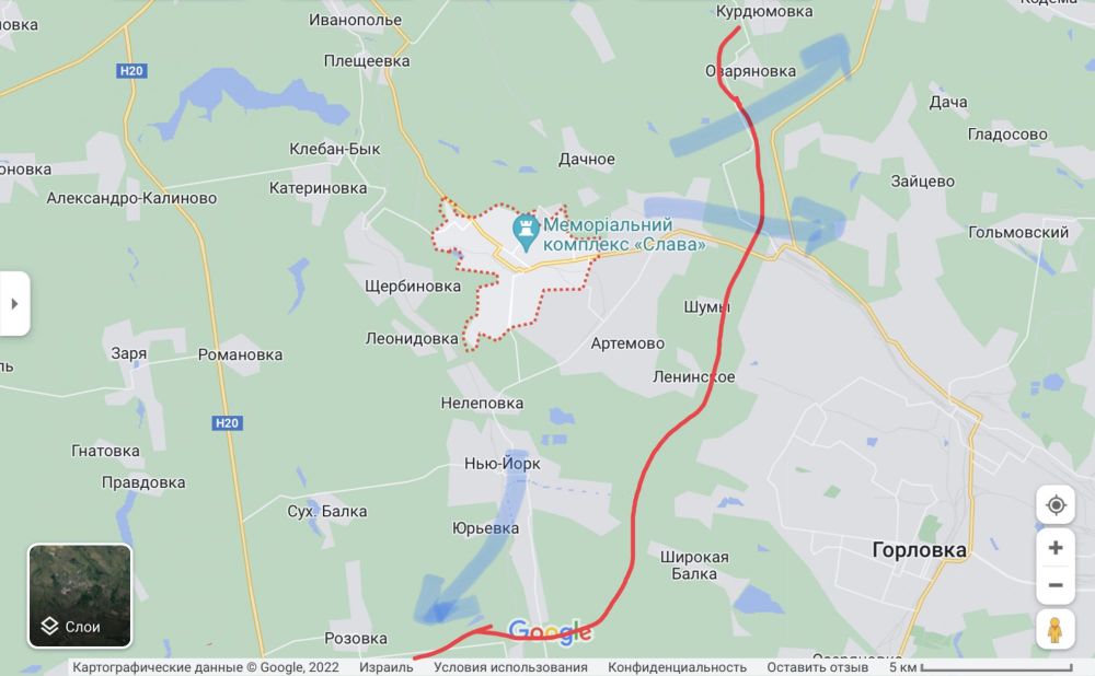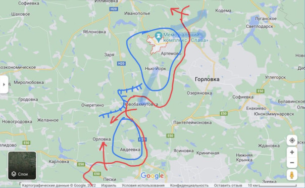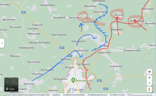 Кроме этого он несет опасность удара во фланг по направлению на Майорск, что приводит к риску окружению всей наступающей южнее Бахмута группировки.