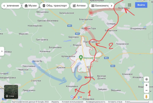 Атакуя Клещеевку и Опытное (цифра 1) вагнеровцы воюющие на этом участке применили свою тактику о которой я рассказывал в заметке Имперские штурмовики. Они скрытно осуществили маневр и атаковали Подгорное (цифра 2). И хотя развить успех тут очень сложно, если им удасться удержать позицию, то Соледар в ближайшее время может быть взят российскими войсками. Так как севернее взята Яковлевка и есть возможность обойти Соледар с севера.