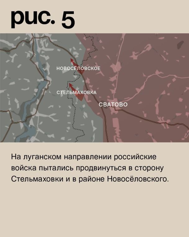 На луганском направлении российские войска пытались продвинуться в сторону Стельмаховки и в районе Новосёловского. (Рис. 5)
