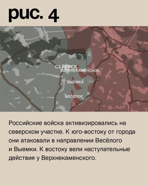 Российские войска активизировались на северском участке. К юго-востоку от города они атаковали в направлении Весёлого и Выемки. К востоку вели наступательные действия у Верхнекаменского. (Рис. 4)