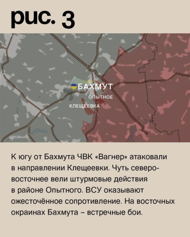 К югу от Бахмута ЧВК «Вагнер» атаковали в направлении Клещеевки. Чуть северо-восточнее вели штурмовые действия в районе Опытного. ВСУ оказывают ожесточённое сопротивление. На восточных окраинах Бахмута – встречные бои. (Рис. 3)