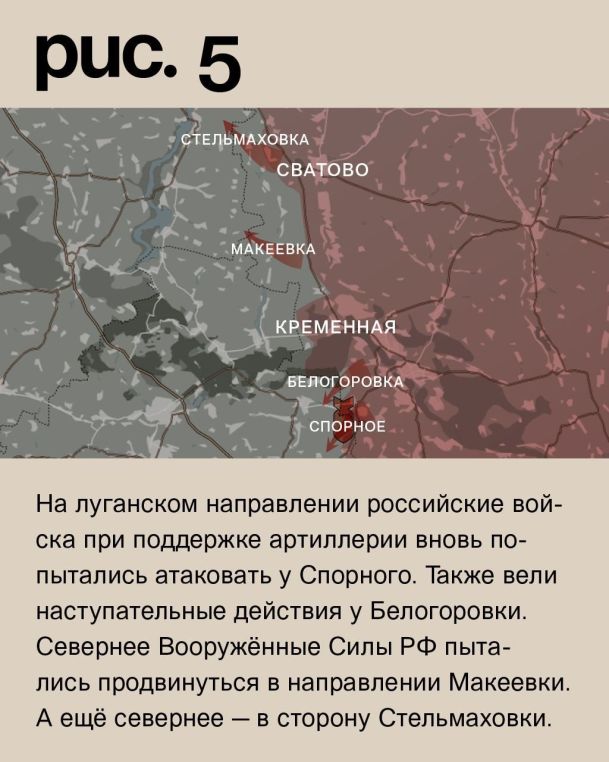 На луганском направлении российские войска при поддержке артиллерии вновь попытались атаковать у Спорного. Также вели наступательные действия у Белогоровки. Севернее Вооружённые Силы РФ пытались продвинуться в направлении Макеевки. А ещё севернее – в сторону Стельмаховки. (Рис. 5)