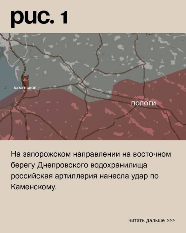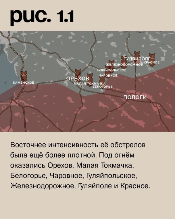 На запорожском направлении на восточном берегу Днепровского водохранилища российская артиллерия нанесла удар по Каменскому. Восточнее интенсивность её обстрелов была ещё более плотной. Под огнём оказались Орехов, Малая Токмачка, Белогорье, Чаровное, Гуляйпольское, Железнодорожное, Гуляйполе и Красное. (Рис. 1)