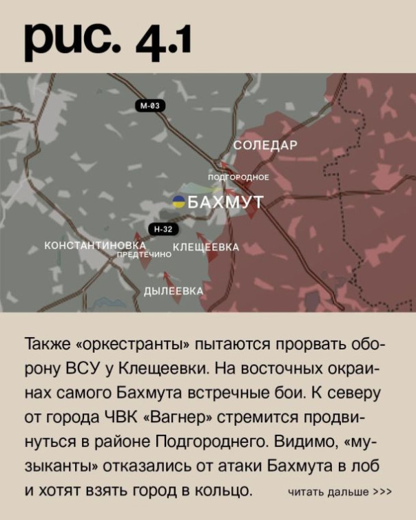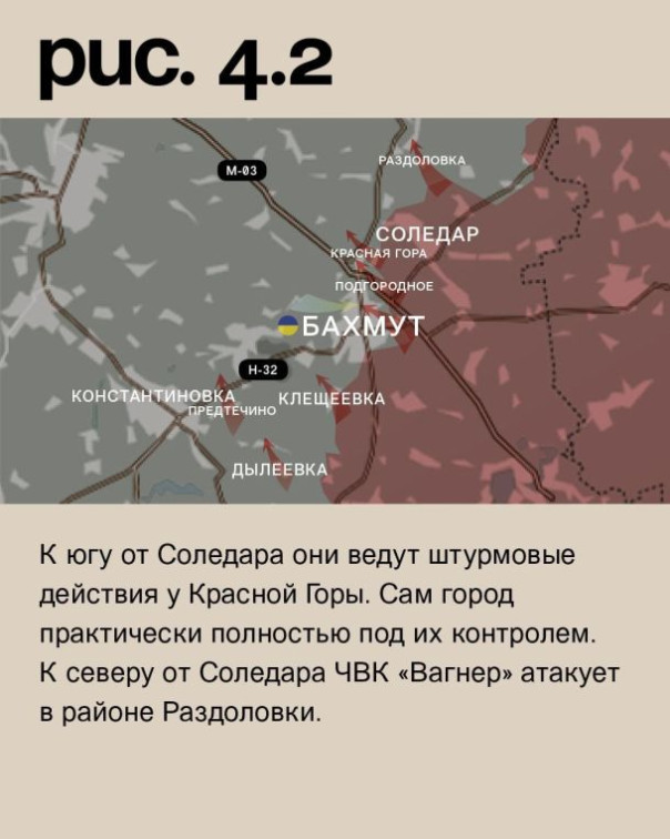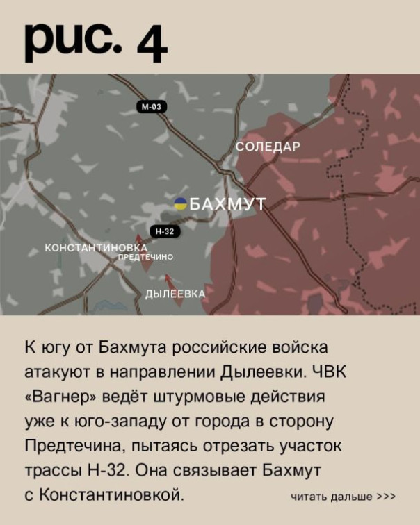 К югу от Бахмута российские войска атакуют в направлении Дылеевки. ЧВК «Вагнер» ведёт штурмовые действия уже к юго-западу от города в сторону Предтечина, пытаясь отрезать участок трассы Н-32. Она связывает Бахмут с Константиновкой. Также «оркестранты» пытаются прорвать оборону ВСУ у Клещеевки. На восточных окраинах самого Бахмута встречные бои. К северу от города ЧВК «Вагнер» стремится продвинуться в районе Подгороднего. Видимо, «музыканты» отказались от атаки Бахмута в лоб и хотят взять город в кольцо. К югу от Соледара они ведут штурмовые действия у Красной Горы. Сам город практически полностью под их контролем. К северу от Соледара ЧВК «Вагнер» атакует в районе Раздоловки. (Рис. 4)