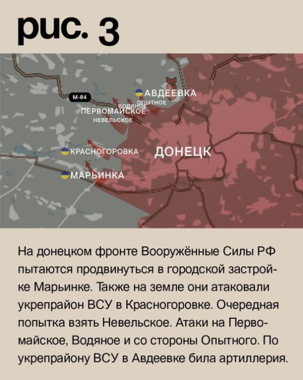 На донецком фронте Вооружённые Силы РФ пытаются продвинуться в городской застройке Марьинке. Также на земле они атаковали укрепрайон ВСУ в Красногоровке. Очередная попытка взять Невельское. Атаки на Первомайское, Водяное и со стороны Опытного. По укрепрайону ВСУ в Авдеевке била артиллерия. (Рис. 3)