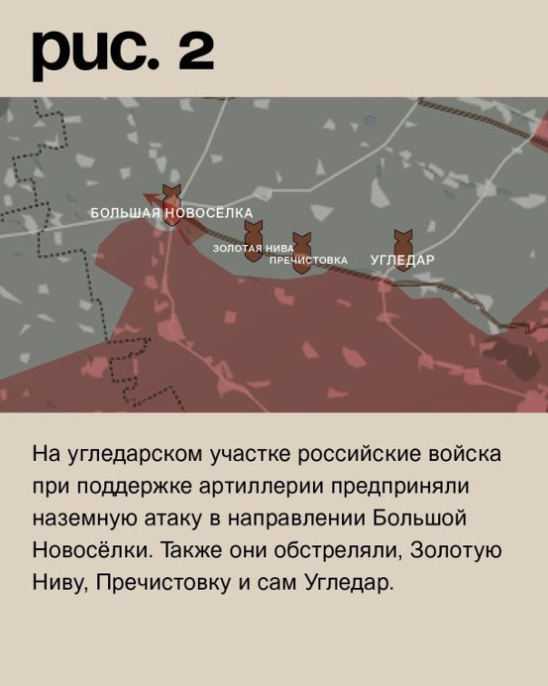На угледарском участке российские войска при поддержке артиллерии предприняли наземную атаку в направлении Большой Новосёлки. Также они обстреляли Золотую Ниву, Пречистовку и сам Угледар. (Рис. 2)