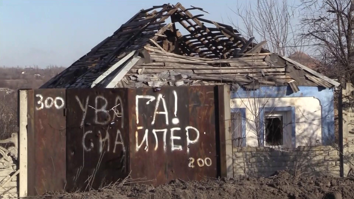 Экскурсию по Марьинке нам проводит Штык. Со своей штурмовой ротой он заходил сюда одним из первых. Обращаем внимание, что на остатках домов осталось что угодно, но ни одного названия улицы. "Таблички они снимали специально, чтобы потом мы координаты не передавали", – пояснил Штык. Подбитая украинская техника повсюду. Украинские надписи на воротах, причем самые разные.