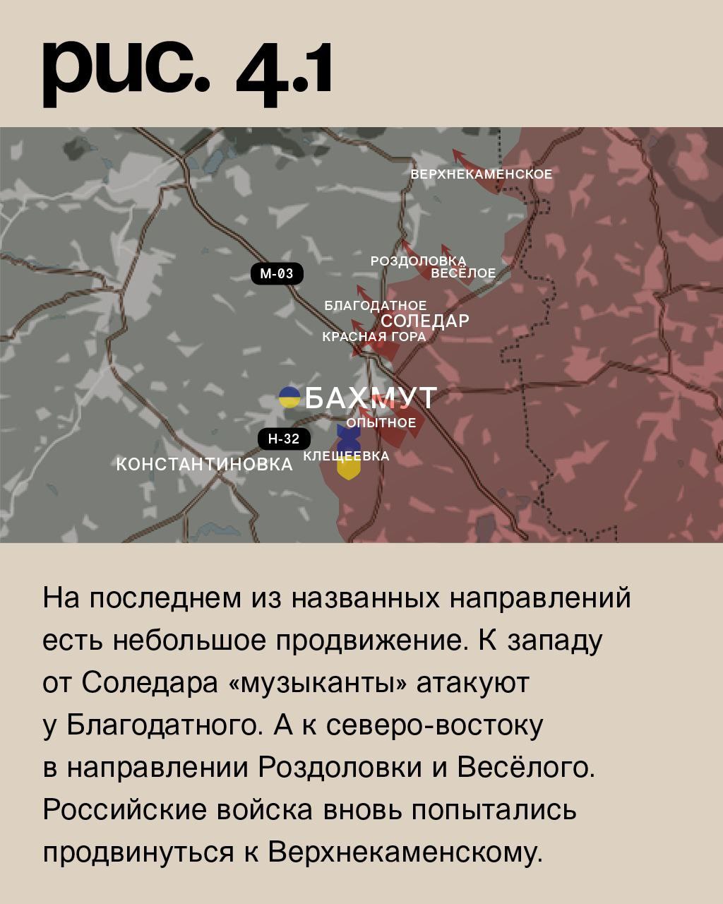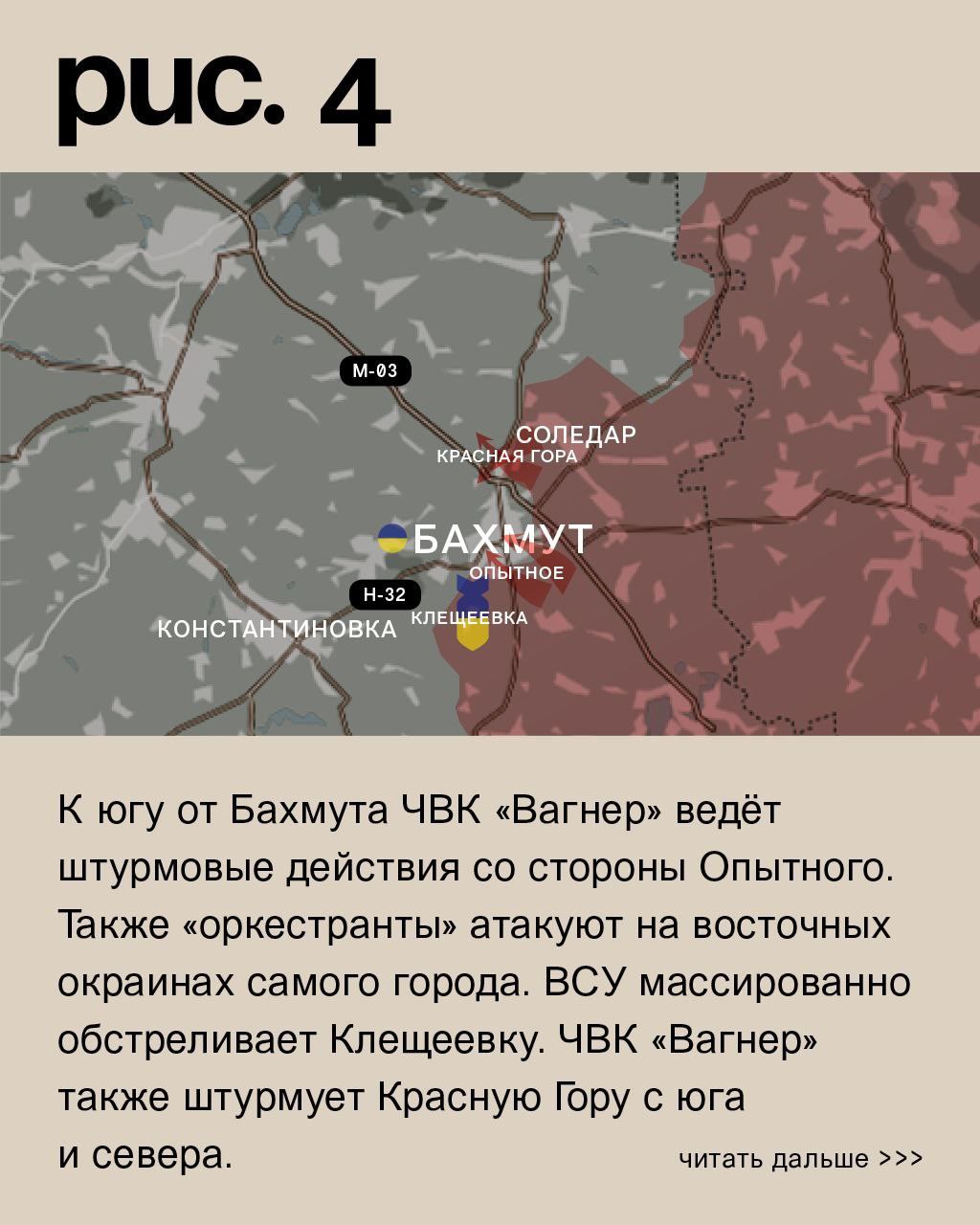 К югу от Бахмута ЧВК «Вагнер» ведёт штурмовые действия со стороны Опытного. Также «оркестранты» атакуют на восточных окраинах самого города. ВСУ массированно обстреливает Клещеевку. ЧВК «Вагнер» также штурмует Красную Гору с юга и севера. На последнем из названных направлений есть небольшое продвижение. К западу от Соледара «музыканты» атакуют у Благодатного. А к северо-востоку в направлении Роздоловки и Весёлого. Российские войска вновь попытались продвинуться к Верхнекаменскому. (Рис. 4)