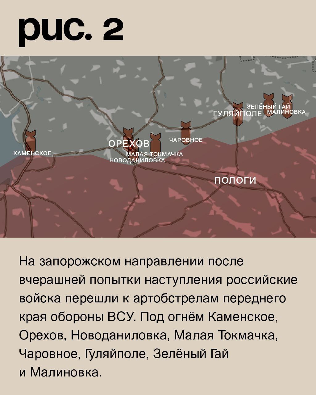 На запорожском направлении после вчерашней попытки наступления российские войска перешли к артобстрелам переднего края обороны ВСУ. Под огнём Каменское, Орехов, Новоданиловка, Малая Токмачка, Чаровное, Гуляйполе, Зелёный Гай и Малиновка (Рис. 2)