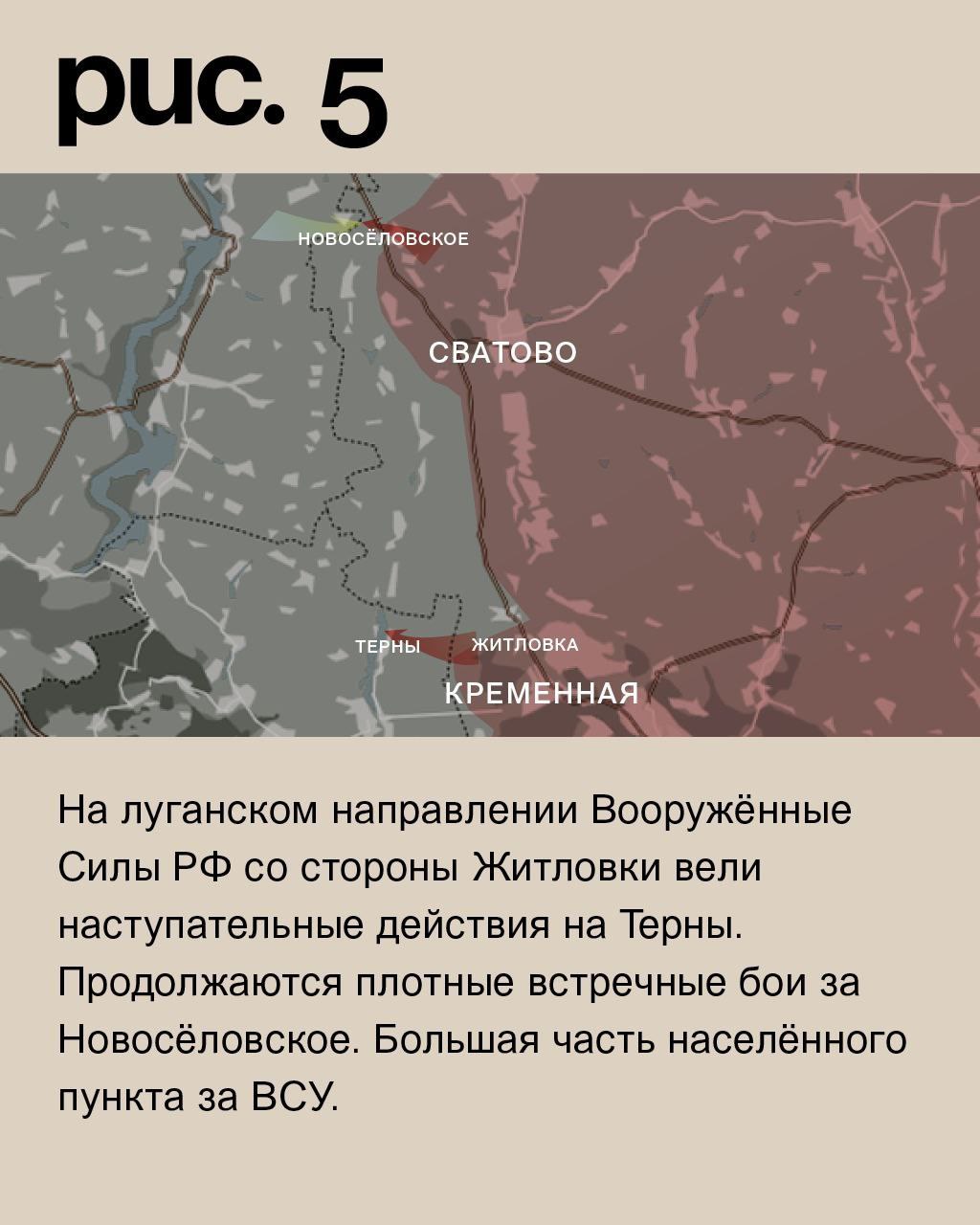 На луганском направлении Вооружённые Силы РФ со стороны Житловки вели наступательные действия на Терны. Продолжаются плотные встречные бои за Новосёловское. Большая часть населённого пункта за ВСУ. (Рис. 5)