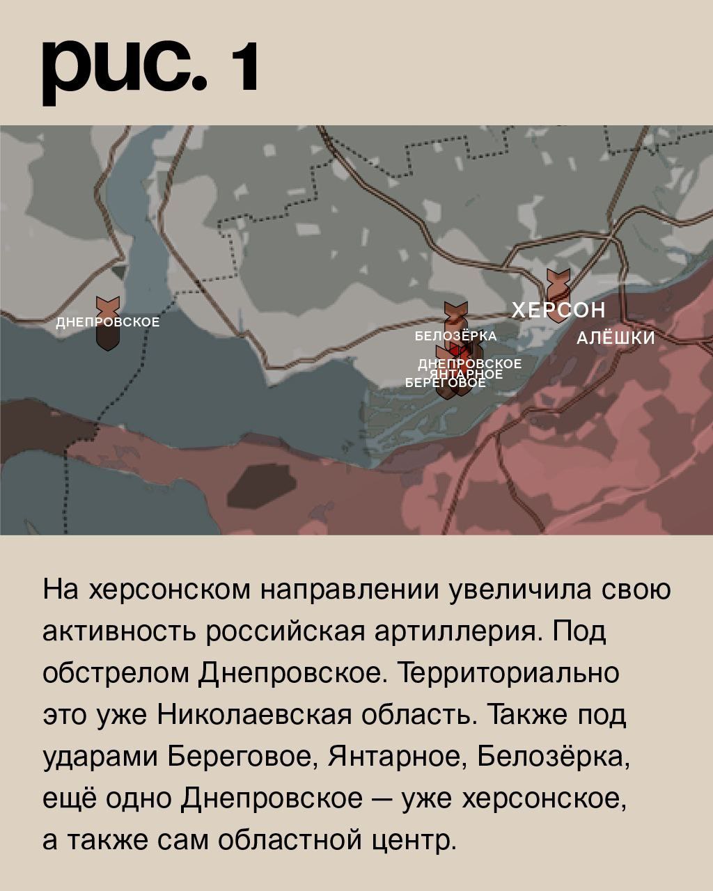 На херсонском направлении увеличила свою активность российская артиллерия. Под обстрелом Днепровское. Территориально это уже Николаевская область. Также под ударами Береговое, Янтарное, Белозёрка, ещё одно Днепровское – уже херсонское, а также сам областной центр. (Рис. 1)