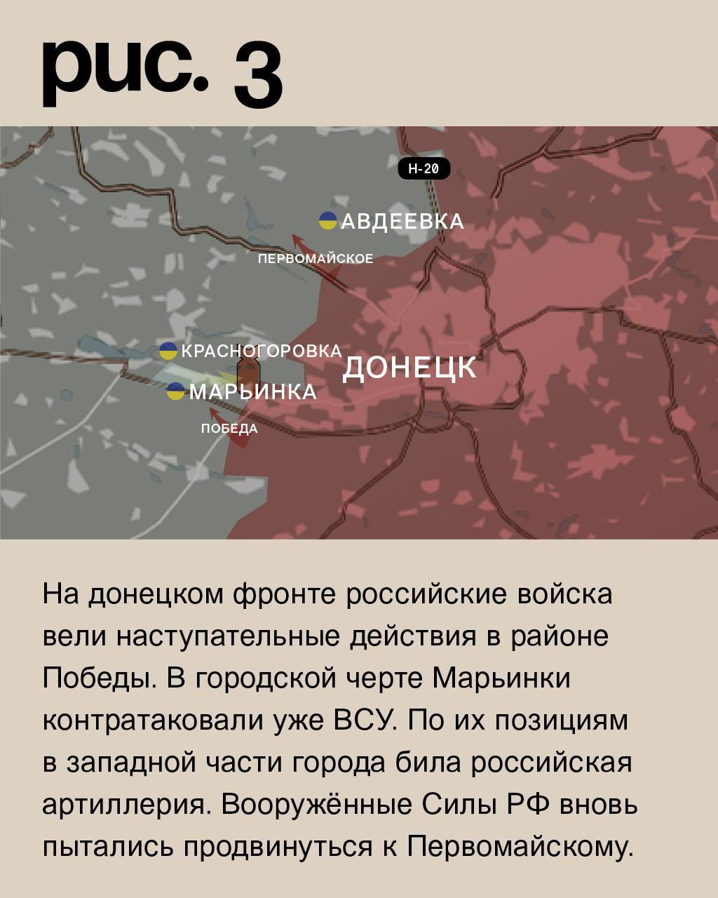 На донецком фронте российские войска вели наступательные действия в районе Победы. В городской черте Марьинки контратаковали уже ВСУ. По их позициям в западной части города била российская артиллерия. Вооружённые Силы РФ вновь пытались продвинуться к Первомайскому. (Рис. 3)