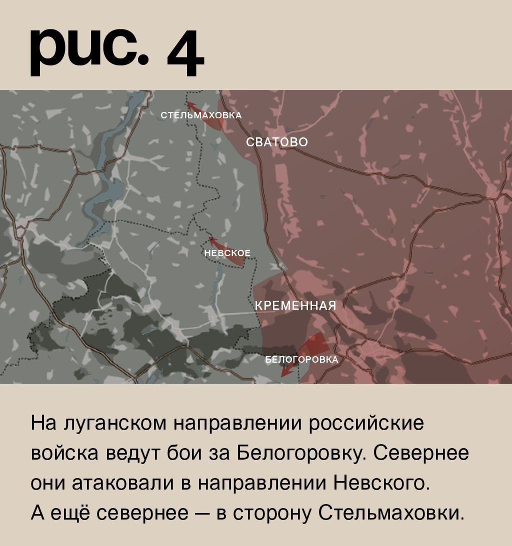 На луганском направлении российские войска ведут бои за Белогоровку. Севернее они атаковали в направлении Невского. А ещё севернее – в сторону Стельмаховки. (Рис. 4)